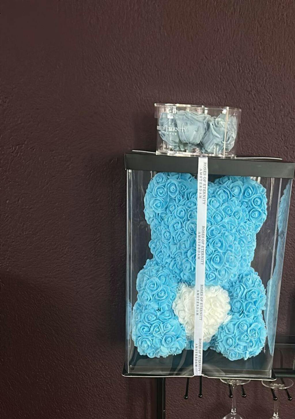 This life-size rose bear is made of synthetic roses that are placed 1 by 1 by hand on the bear transforming him into a rose bear. The rose bear is finished with precision. An elegant symbol of love & friendship.